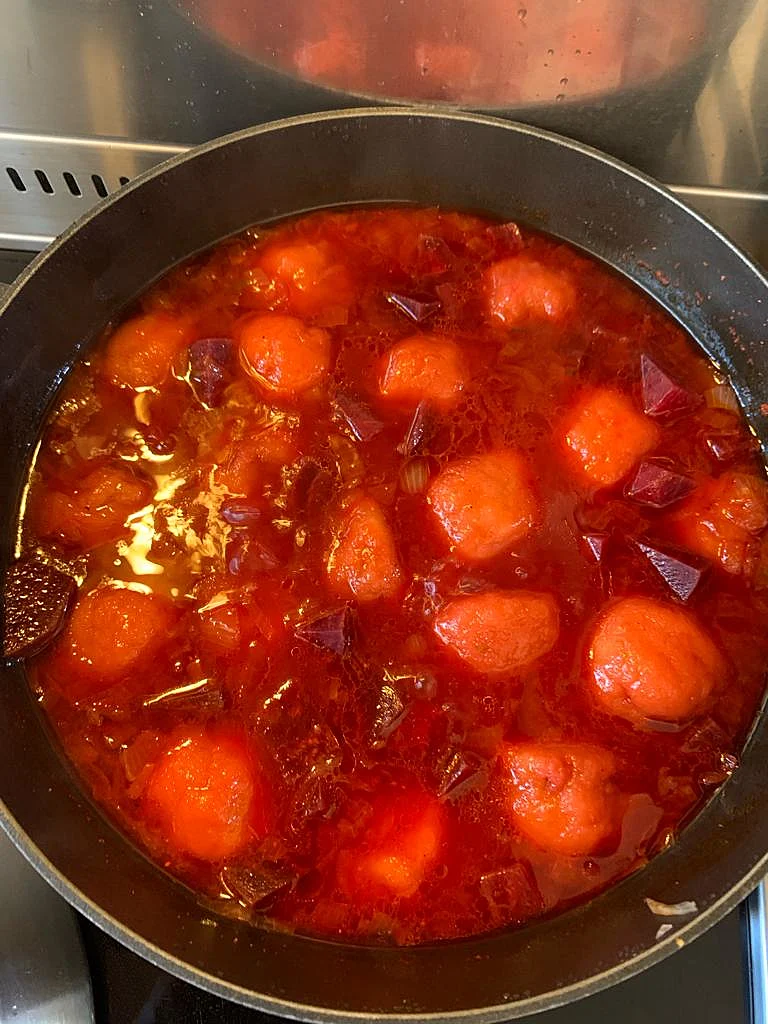 4. נטגן בצל וסלרי נוסיף רסק, 2 מהסלקים ותבלינים וליטר וחצי מים, כשרותח נוסיף בעדינות את הקובות וננמיך להבה