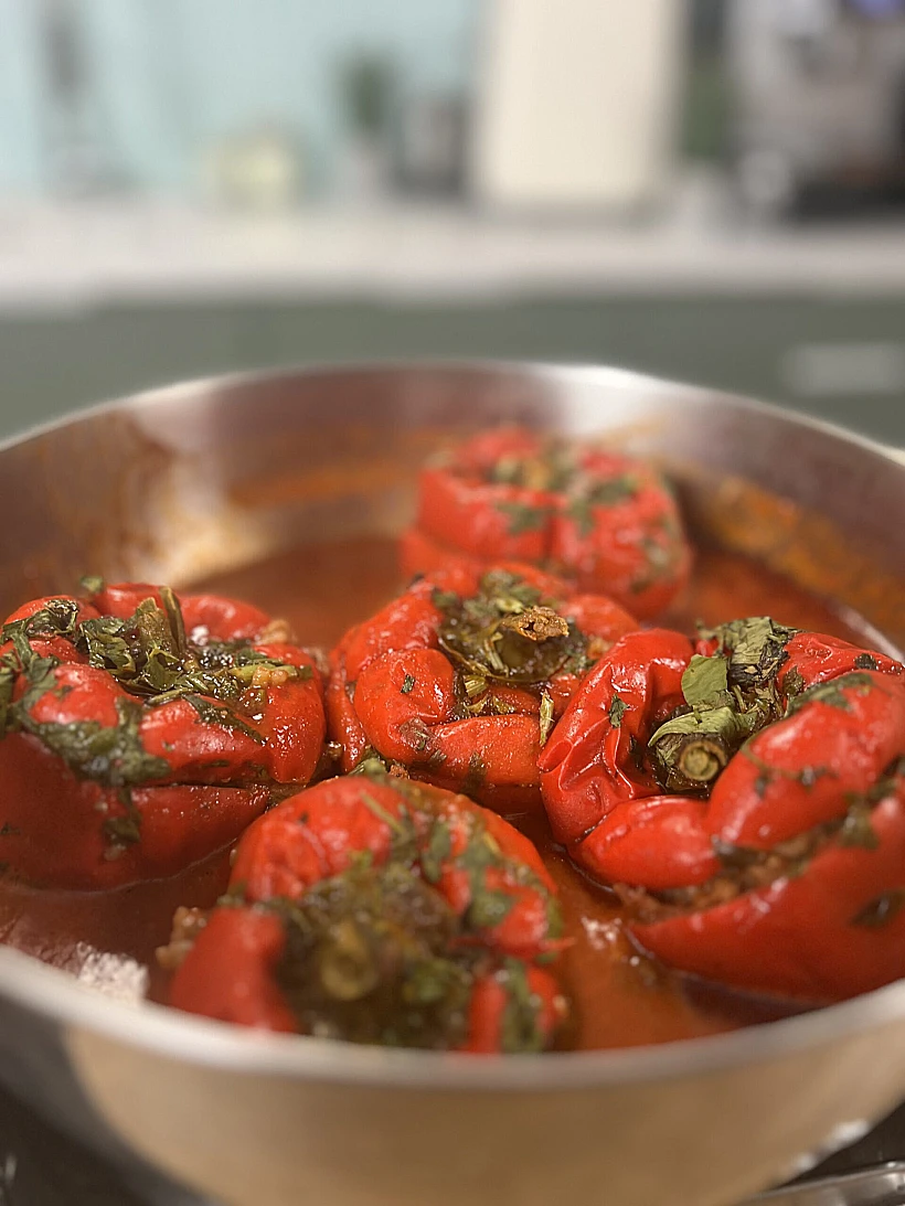 - ממלאים את הפלפלים בתערובת האורז, הבשר והירק ומניחים אותם ברוטב שבסיר השני למשך שעה. מידי פעם מומלץ להרטיב את הפלפלים מלמעלה ברוטב.