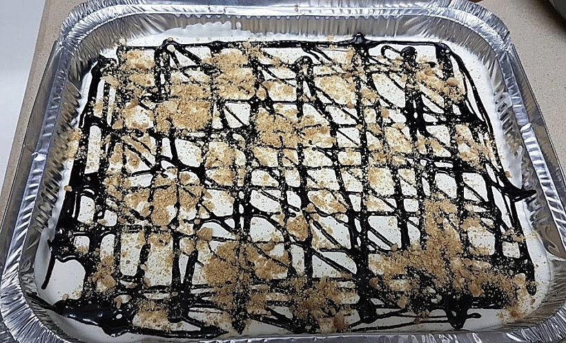 - כאשר הבוואריה מוכנה, לפזר עליה פתיבר מגורד וסירופ שוקולד