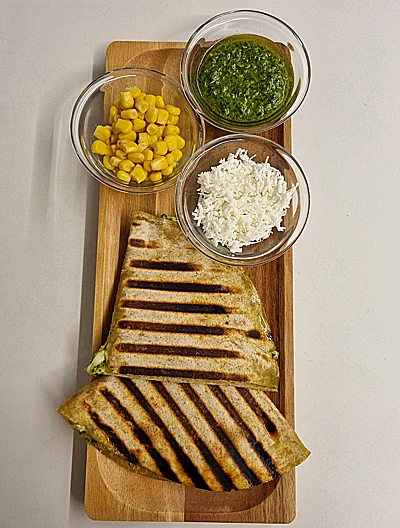 - על הטורטיה או הבייגל מורחים ממרח פסטו ועליו מגרדים גבינה בולגרית