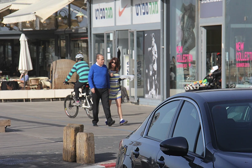 צהריי היום נמל תל-אביב העוברים והשבים לא יכלו להתעלם מהשר לפיתוח הנגב והגליל סילבן שלום מגיע עם אשתו ג׳ודי ניר מוזס שלום לצהריים על טהרת הרומנטיקה.