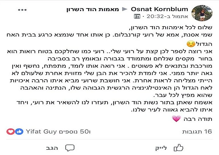 קורנבלום ניגשה אל המקום בו כולם נמצאים, לפחות אותם אנשים בעלי השפעה ויכולת הצבעה, והעלתה פוסט מרגש בקבוצה של תושבי הוד השרון בפייסבוק. בפוסט אותו העלתה אמש (שלישי), כתבה: "שלום לכל אימהות הוד השרון, שמי אסנת, אמא של רועי קורנבלום. כן אותו אחד שנמצא כרגע בבית האח הגדול. אני רוצה לספר לכן קצת על רועי שלי... רועי כמו שחלקכם בטוח רואות הוא בחור מקסים שנלחם ומתמודד בגבורה ובאומץ רב בסביבה מורכבת ובתנאים לא פשוטים. אני רואה אותו לומד, מתפתח, נחשף ואין גאה יותר ממני. אני לומדת להכיר את הבן שלי מזווית אחרת שלעולם לא הייתי מצליחה לראות אחרת. אני חושבת שרועי מביא איתו הרבה איכויות לאח הגדול הן האינטיליגנציה הרגשית הגבוהה שלו, הנתינה והאהבה שהוא מפיץ לכל עבר. אשמח שאתן בתור נשות הוד השרון, תעזרו לנו להשאיר את רועי, ויחד איתו להביא גאווה לעיר שלנו. תודה רבה (לב)" .