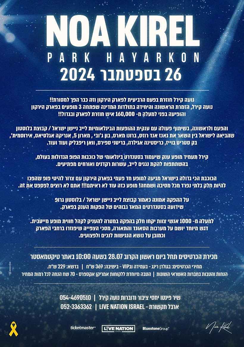 נועה קירל תופיע שוב בפארק: "מקווה שעד ההופעה כל החטופים יחזרו"
