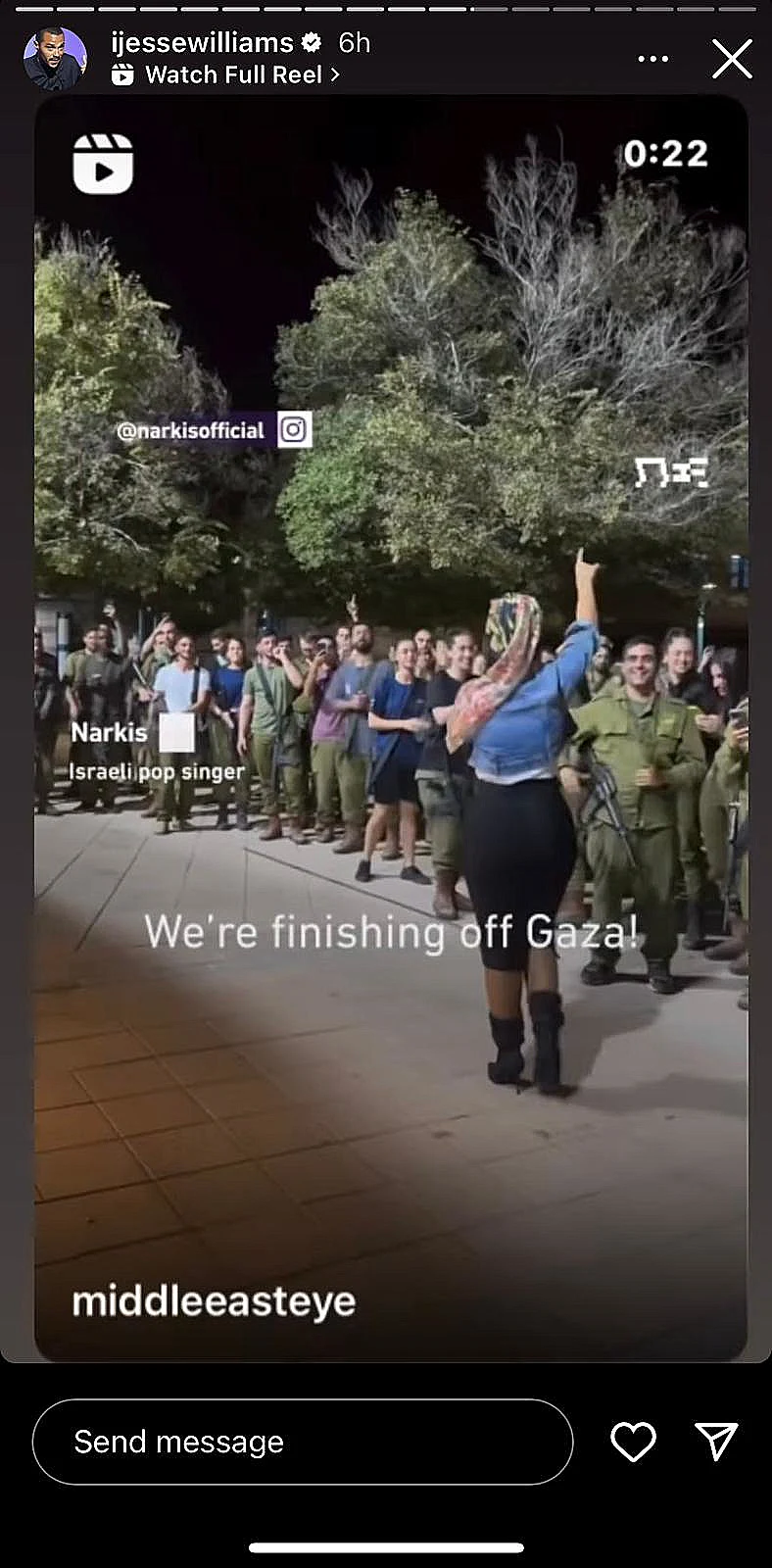 הלילה (שני), שיתף ויליאמס סרטון שבו נראית הזמרת נרקיס מופיעה מול חיילי צה"ל, ושרה: "גומרים את עזה" ו"מחזירים את גוש קטיף". הסרטון המקורי פורסם בעמוד אינסטגרם בשם "העין במזרח התיכון", אחריו עוקבים כמיליון משתמשים והוא מקדם הסברה נגד ישראל ובעד עזה.