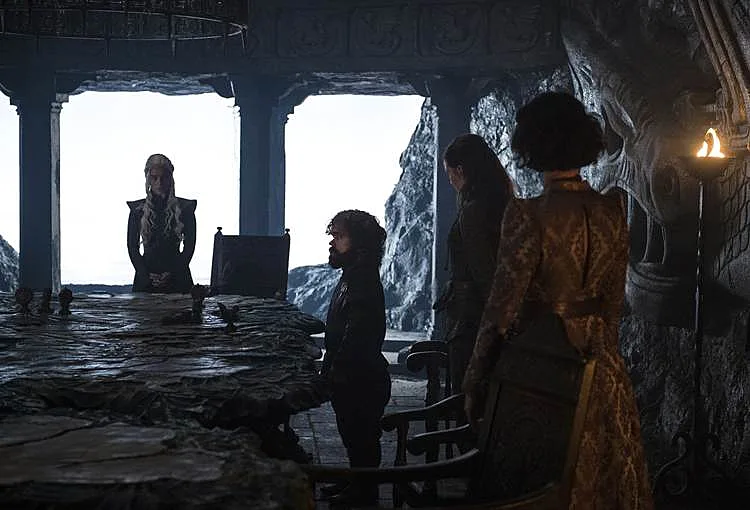 בינתיים דאיינריז (זהו? כבר אין חאליסי?) רוצה לרשת את הכס בלי מלחמות. בכינוס מועצת הביטחון שלה היא מדברת על מצור שיכריע את מעלה המלך. מצחיק מאוד. את עושה גם בר מצוות עם ההומור הזה? הרי סרסיי תהרוג גם את הילד הרביעי, שאין לה, כדי להמשיך ולהיות מלכה. בינתיים היא מסתפקת בנשק הסודי נגד דרקונים - קשת ענקית וקטלנית שהרגה את הדרקון המיתולוגי של אאיגון, בסצנה ששוב מזכירה את ההוביט. מי שמתווה את האסטרטגיה אצל דאיינריז הוא טריון, כנראה האדם הכי חכם בווסטרוז, שממליץ לפצל כוחות ולשלוח את הגרייג'ויז למצור. ראינו איך זה נגמר. כנראה שלדאיינריז לא תהיה ברירה אלא "להיות דרקונית", כמו שממליצה לה אולנה הזקנה.