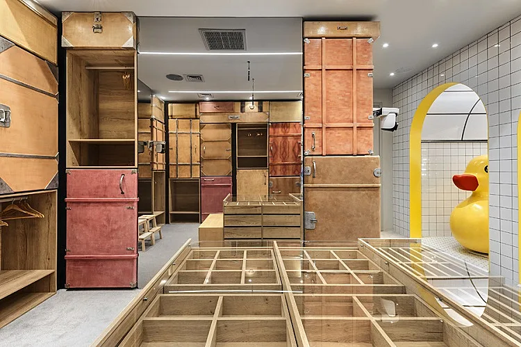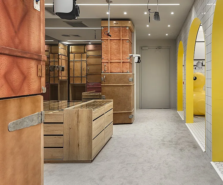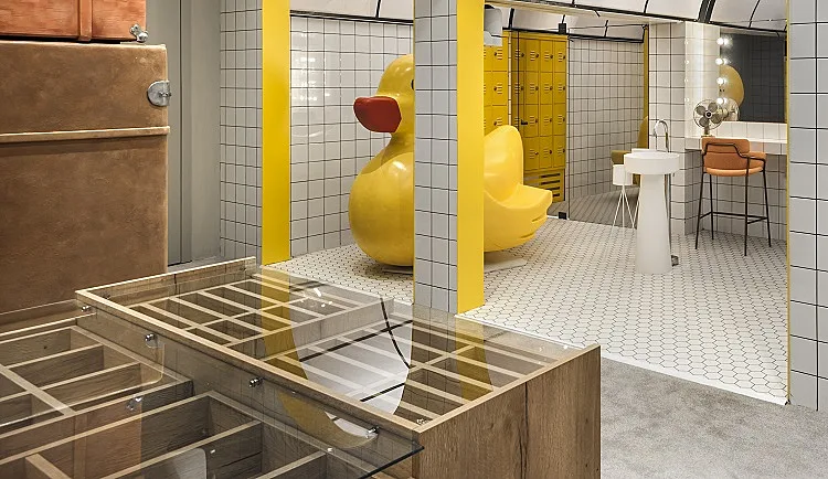 בנוסף עוצב אי גדול במרכז חדר הארונות הכולל 16 מגירות של בלום בשליפה מלאה מחולקות לנוחיות המשתמש ולמעלה פלטת זכוכית שקופה מחוסמת המאפשרת לראות את פנים המגרות.