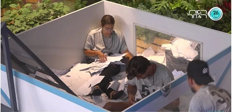 הדיירים מחליטים לחלק את העבודה ביניהם כדי שכולם יוכלו גם לעבוד וגם לישון ברצף. אליאב נשאר ליד התיבה ומכריז שהוא לא הולך לישון עד שלא מוצאים את המסר. דניאל מאחלת לו שבסוף הוא יהיה זה שימצא את המעטפה עם המסר. דניאל מבקשת מסימה שתאכל מהפתיתים שישראל הכין לארוחה הלילית, אבל סימה מסרבת וטוענת כי לא אכפת לה ללכת לישון רעבה. לאחר מכן, בשיחה עם רועי, היא נזכרת כששמעה שצעקו לה מחוץ לבית. היא מודה בפני רועי שהניתוק מהעולם הוריד לה את הביטחון וגרם לה לחשוב שהיא לא מעניינת אף אחד. רועי משתתף ברגשותיה ואומר שבכל פעם שהוא שומע שצועקים לו הוא מרגיש את אותו הדבר.