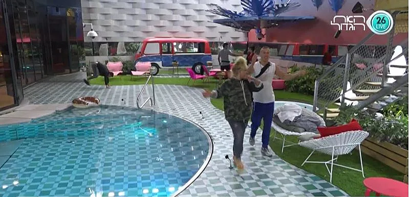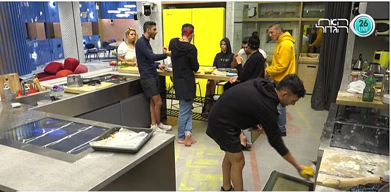 מירב עוזרת לישראל להתאפר לקראת המתיחה, ואורלי בטוחה שכל הדיירים יאמינו לו. לאחר האיפור, ישראל יוצא לסלון והדיירים מופתעים. אליאב מצטרף ללירז, סמואל ושמס בסלון ואומר שבגלל שהוא ממעט לדבר לא כיף לו בבית. לירז מציעה לו להכין פיצות לדיירים לארוחת הערב. לירון משתף את ישראל, מריה ותמי שהוא מתגעגע לשיחות עם אנשים בלי מצלמות. הוא גם משתף בתובנה שלמד על עצמו. מצד אחד, הוא שמח ועושה צחוקים כל הזמן ומצד שני הוא מרגיש עצוב ומרוקן. מגי מדברת עם רועי על החיבורים שיש לה עם דיירי הבית. היא אומרת שהזמן גרם לה להכיר אנשים וזאת כנות ולא צביעות. רועי אומר למגי שההתקרבות שלה לישראל יצרה ריחוק ביניהם וגם בינה לבין מריה. מגי אומרת לו שאם הוא או מריה רוצים לדבר, הם תמיד מוזמנים לבקש ממנה או להצטרף לשיחה שלה ושל ישראל.