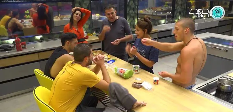הדיירים יושבים בחצר לארוחה בניחוח איטלקי: פסטה, פיצה ורוגלך עם נוטלה. מירב מכריזה: "אמאל'ה, איך טעים!", ורק רועי עומד בצד, לא אוכל, טוען שהוא לא רעב.