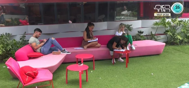 מריה, מירב, אביבית, אליאב וישראל, חמישיית הגמר בשבילכם, יושבים בפינת הישיבה בחצר. הם מנסים עדיין לעכל שהם חמשת הדיירים הסופיים שזכו להגיע לישורת האחרונה. אביבית משתפת שאחרי שאדל יצאה היא חשבה שהיא זו שהולכת אחריה. מריה משתפת שהיא לא מאמינה שרועי לא פה ושהיא דווקא כן, ואביבית, שמבינה למה מריה בהלם, מסכימה איתה שהוא כל הזמן ניסה לעודד אותה בזמן שהוא בכלל לא העלה על דעתו שהוא זה שיודח. אביבית מרגיעה את מריה ומבקשת ממנה לא לדאוג כי בטוח הוא יקבל המון אהבה בחוץ.