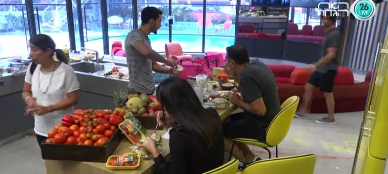 הדיירים מתיישבים לאכול ארוחת בוקר חקלאית ומפנקת, חוץ מעמוס שאוכל ארוחת בוקר שאביבית מקצה לו ללא סלטים וללא גבינות עתירות שומן.