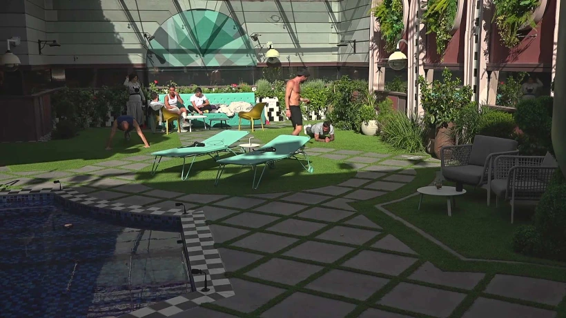 ג'וזי ואופיר עורכים אימון בוקר בחצר הבית בזמן שחלק מהדיירים יושבים על הספה ועושים שיחות בוקר.