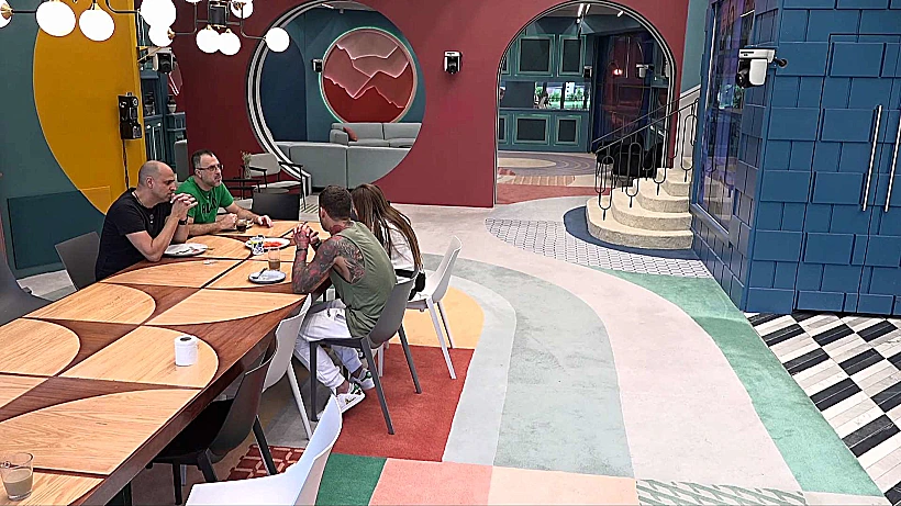הדיירים מתיישבים סביב השולחן ואוכלים ארוחת צהריים.