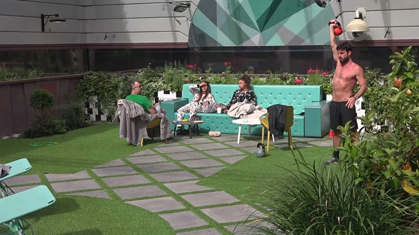 דניאל וג'וזי עורכים אימון בוקר בחצר הבית. רמי ואורן צופים בדניאל מתאמן ומדברים על כך שאימוני כוח משעממים אותם והם אוהבים לעשות ספורט רק אם הוא תחרותי.