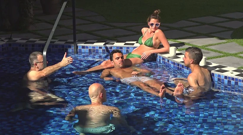 הגברים מדברים בחצר על סרטים שאסור לפספס ונהנים מזמן איכות בבריכה.