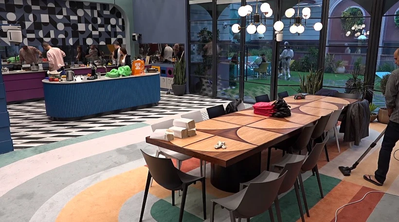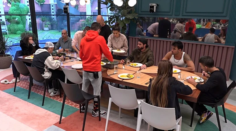 הדיירים יושבים סביב שולחן האוכל ואוכלים ארוחת צהריים מאוחרת.