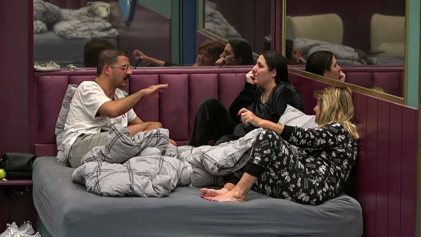 הדיירים יושבים יחד בחדר השינה וגל מספרת להם מה קרה מהרגע שגיא ולירון התקשרו אליה במוצ"ש.