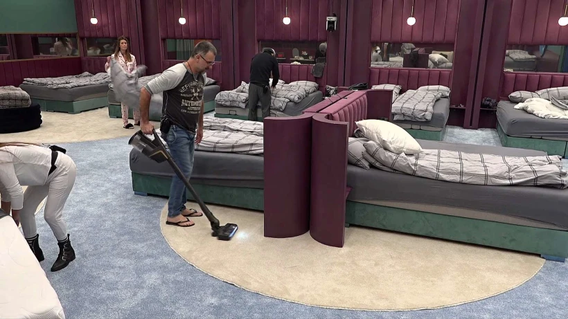 הדיירים מנקים במרץ בזמן שהאח הגדול מעביר להם את הזמן עם מוזיקה.