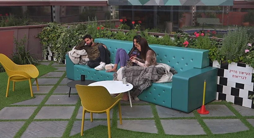 אלמוג ודניאל פותחים את הבוקר כשהם שותים קפה ושרים על הספה בחצר הבית.