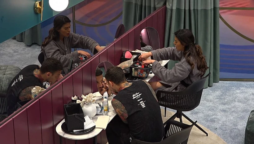 אלמוג מסדרת לזהבה ולקארין את השיער, קארין מאפרת את זהבה ויתר הדיירים מתארגנים.