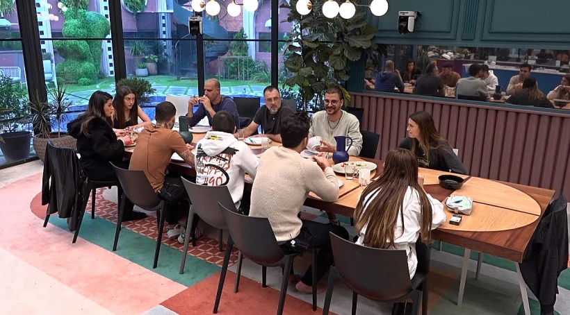 תום וג'וזי יושבים בפינת האוכל, בוחנים את תמונות הדיירים ומשוחחים על ההדחה הקרובה.