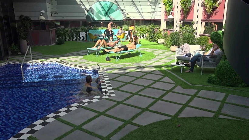 דרור ואורן נכנסים לטבילת בוקר בבריכה. דרור מסביר לאורן איך מתנהלים הדיירים בימים בהם יש משדר הדחה.