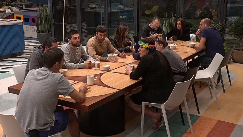 הדיירים מתיישבים סביב שולחן האוכל ואוכלים ארוחת בוקר.