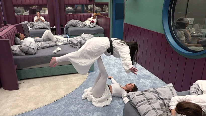האח הגדול משמיע לדיירים מנגינות בהשראת אשראם, גל וימית נכנסות לאווירה ומבצעות תרגילי אקרובאלאנס.