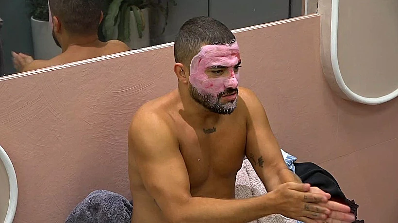 הדיירים בהתארגנויות הבוקר שלהם בשירותים, ואור ממתין בסבלנות עד שיוכל להוריד את המסיכה הורודה מפניו