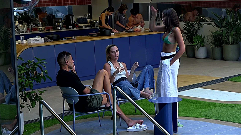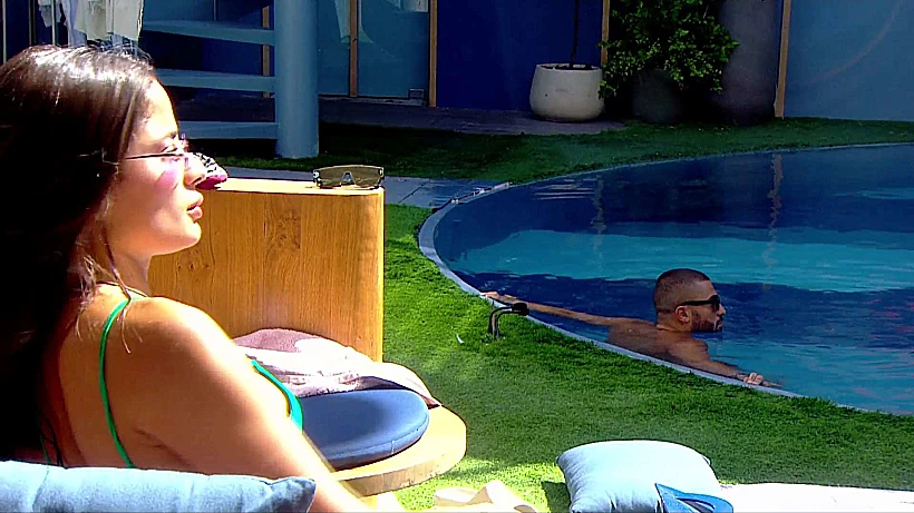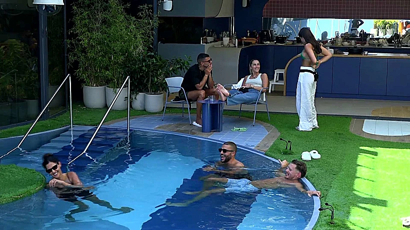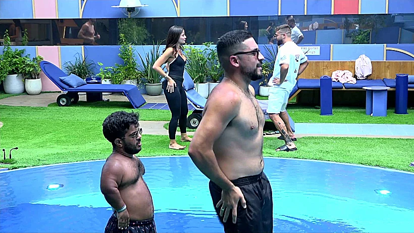 מחוץ לבריכה, הדר, קרן ואיציק מדברים על ההדחה הערב, ועל כך שאין להם יכולת לדעת בחוץ מי מהדיירים החדשים בולט יותר. הדר אומרת שהדינמיקה משתנה כל 4 שעות בבית. קרן מספרת שהצופה בבית רואה ומרגיש דברים אחרת מאשר הדיירים בבית. בהמשך השיחה איציק אומר לדני שבבריכה, שהיום בהדחה בערב ישאירו את שניהם לסוף ואז הוא (איציק) ילך הביתה.