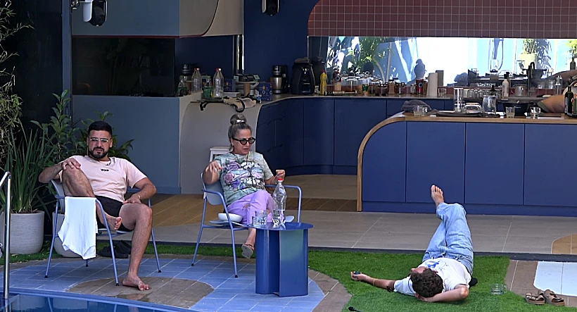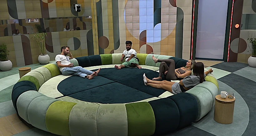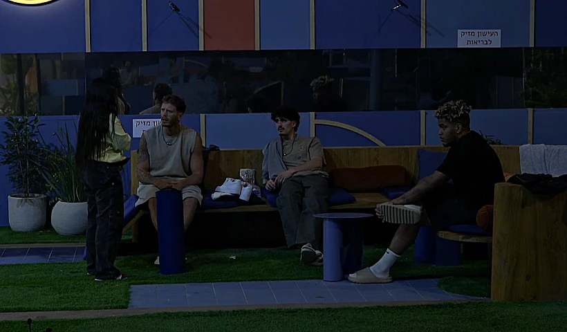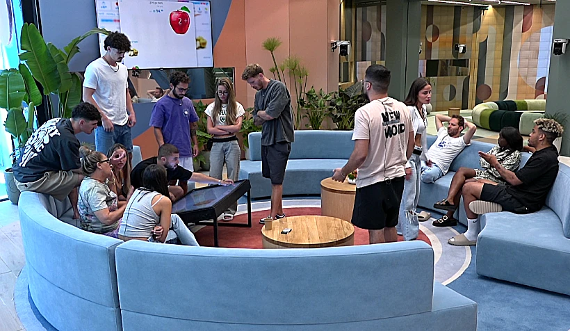 הדיירים בסלון, מתווכחים ביניהם בישיבת התקציב ומנסים להחליט איך לחלק את התקציב בין הבקשות של כולם.
