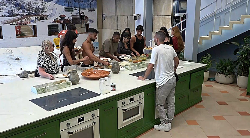 הדיירים מתכנסים במטבח ונהנים מארוחת צהריים מאוחרת.