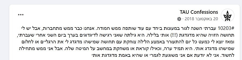 אבל בכל זאת, זה נשמע שהיה לה קשר קרוב עם השותפים, בניגוד לפוסט שפורסם בקבוצת "TAU Confessions" שבו התלוננה הדיירת על השותפה שאיתה היא כל כך לא מסתדרת עד כדי כך שהיא כבר בורחת להורים ונמצאת בדירה רק יומיים בשבוע: