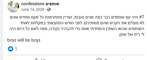 בקבוצה "שותפים confessions" אחת המשתתפות האנונימיות סיפרה על סיפור משעשע במיוחד. כדי להבהיר לשותף שלה שיעלה את הקרש של האסלה לפני שהוא משתין, היא התחבאה במקלחת ותוך כדי שהשותף השתין היא הפחידה אותו: "מפה לשם כל היום היה לי ריח של שתן".