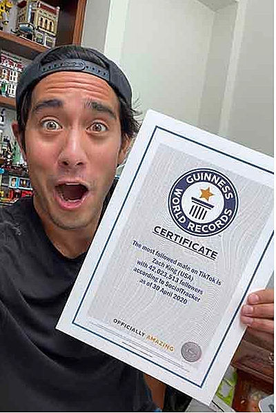 כעת ספר השיאים של גינס העניק לו את התואר הרשמי עם תעודה שמכריזה עליו כסרטון הטיקטוק הנצפה ביותר. זאק מחזיק גם במקומות השלישי והרביעי ברשימה מכובדת זו, וזכה אפילו לאדם הנעקב ביותר בטיקטוק בשנת 2020 עם 42 מיליון עוקבים (מספר שכבר הספיק לטפס בעוד 30 מיליון)