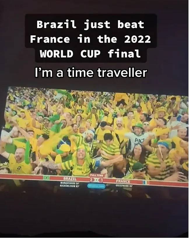 בסרטון החדש שפרסם וגרף יתר מ-21 מיליון צפיות בטיקטוק, כתב: "ברזיל עכשיו ניצחה את צרפת בגמר מונדיאל 2022, אני נוסע בזמן". בסרטון ניתן לראות את חגיגות הקהל הבריזלאי אל מול הקהל הצרפתי המאוכזב, ואת שחקני שתי קבוצות מיד לאחר שריקת הסיום.