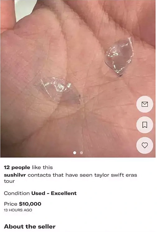 לאחרונה פורסם עוד פריט מכירה מוזר של טיילור סוויפט, כשאחד המעריצים פרסם את עדשות המגע המשומשות שלה בלא פחות מ-10,000 דולר בטענה ש"הן משומשות אך במצב מצוין".