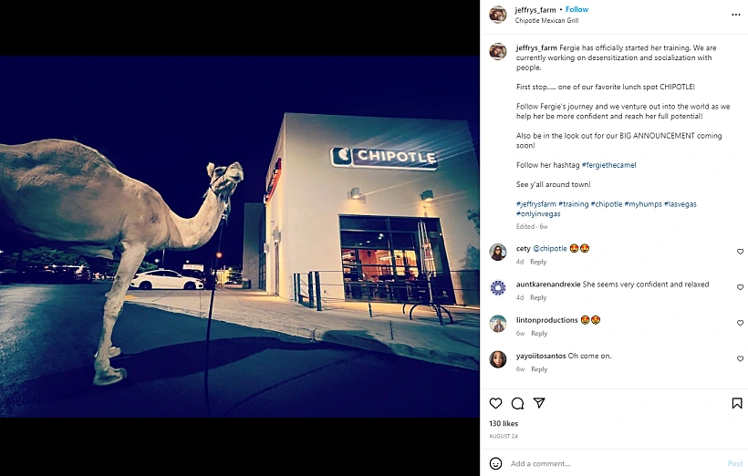 סרטון שצולם מחוץ למסעדה ב-4 באוקטובר מראה גמל דרומדרי ממין נקבה בשם פרגי צועדת בנתיב הנסיעה עם המטפל שלה, ברנדון נובלס.