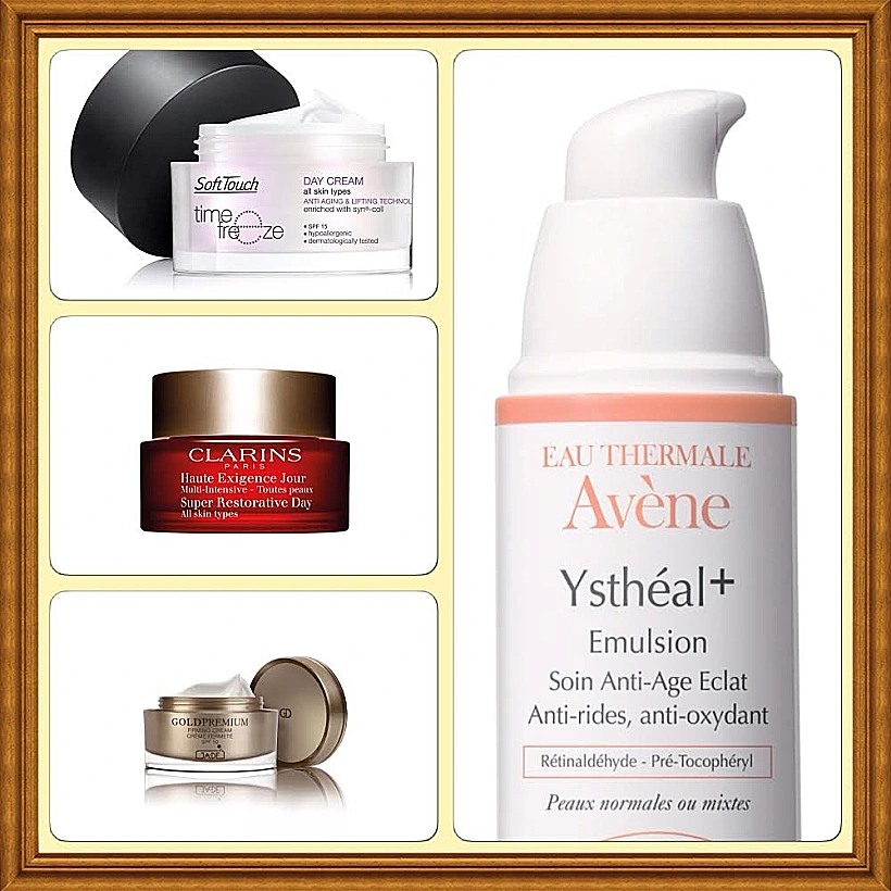 קרם איסיתיאל של Avene לטיפול בקמטים ראשונים. 239 שקלים, קרם לילה/יום מסדרת טייפ פריז של סופט טאץ'. מחיר 272 שקלים, קרם יום מולטי אינטנסיב של קלרינס. מחיר 664 שקלים, GOLD PREMIUM FIRMING CREAM 389.90