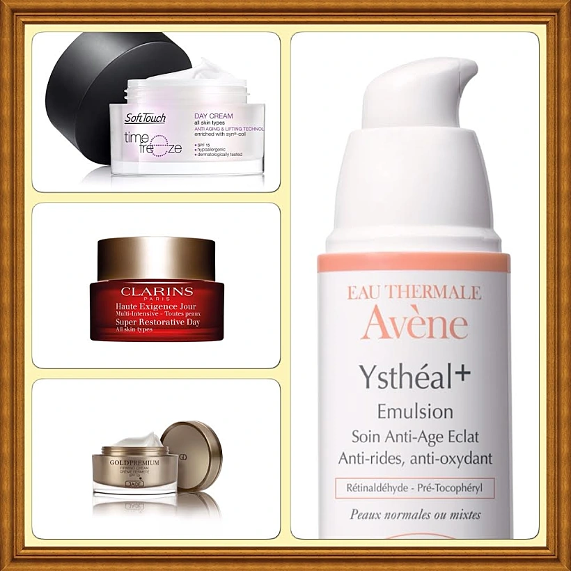 קרם איסיתיאל של Avene לטיפול בקמטים ראשונים. 239 שקלים, קרם לילה/יום מסדרת טייפ פריז של סופט טאץ'. מחיר 272 שקלים,  קרם יום מולטי אינטנסיב של קלרינס. מחיר 664 שקלים, GOLD PREMIUM FIRMING CREAM 389.90