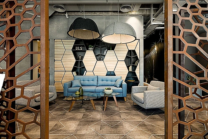 כך למשל, מחיצות עץ תלת ממדיות, המדמות את פנים הגוף, כמו צומחות מהקרקע ומפרידות בין עמדות עבודה למרחב הציבורי. מחיצות אלה מאפשרות לעין לנדוד פנימה ובו בזמן מייצרות פרטיות מסוימת. בו בעת, החלל המרובד יוצר זוויות מבט מעניינות וכך למשל בלובי הכניסה המבט לכיוון הקפיטריה והקיר הירוק עובר דרך אלמנט הברזל המצוי בצדי המדרגות.