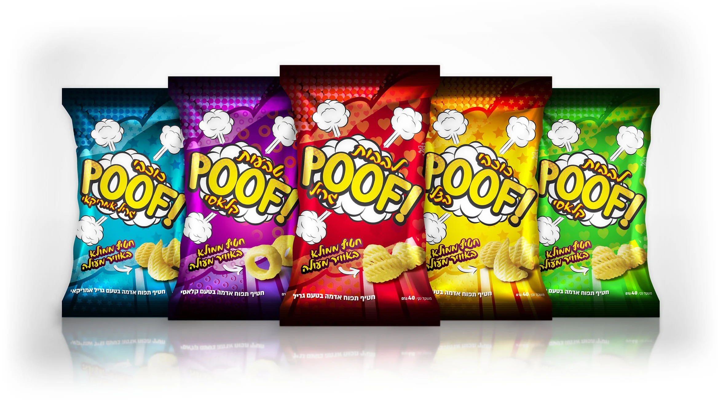 - חטיף POOF- עבור הרגעים האלה שהרעב מנקר בנו ולא מאפשר לנו לחשוב ולהתרכז, חטיף הפוף בטעם המועדף עלייכם יכול לעשות לכם את היום ולסגור לכם פינה. פוף הוא לא סתם עוד חטיף, הוא אוורירי וטעים, נותן לנו רגע לנשום וליהנות מהיום שלנו- ומספק לנו בדיוק את ההפסקה הטעימה שאנחנו צריכים. בנוסף, תהיו בטוחים שברגע שתפתחו את השקית, תהפכו להיות המרכז וכולם יבקשו ׳קצת׳... תחלקו, תהיו חברים