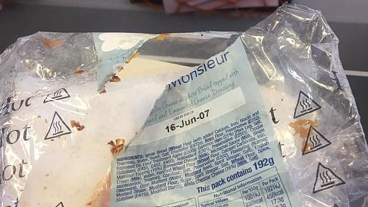 רעבים בטיסה? אולי כדאי שתחשבו פעמיים לפני שאתם נוגעים באוכל שהוגש לכם: אדריאן בל (59), ששב לבריטניה בטיסת איזיג'ט מהאי זקינטוס שביוון, רכש על המטוס מנת טוסט עם גבינה. כשהסתכל על האריזה נחרד לגלות כי התאריך האחרון לשימוש הוא ה-16 ליוני 2007 - כלומר על פי התווית, קצת יותר מעשור עבר מאז המנה הקפואה הייתה ראויה למאכל.