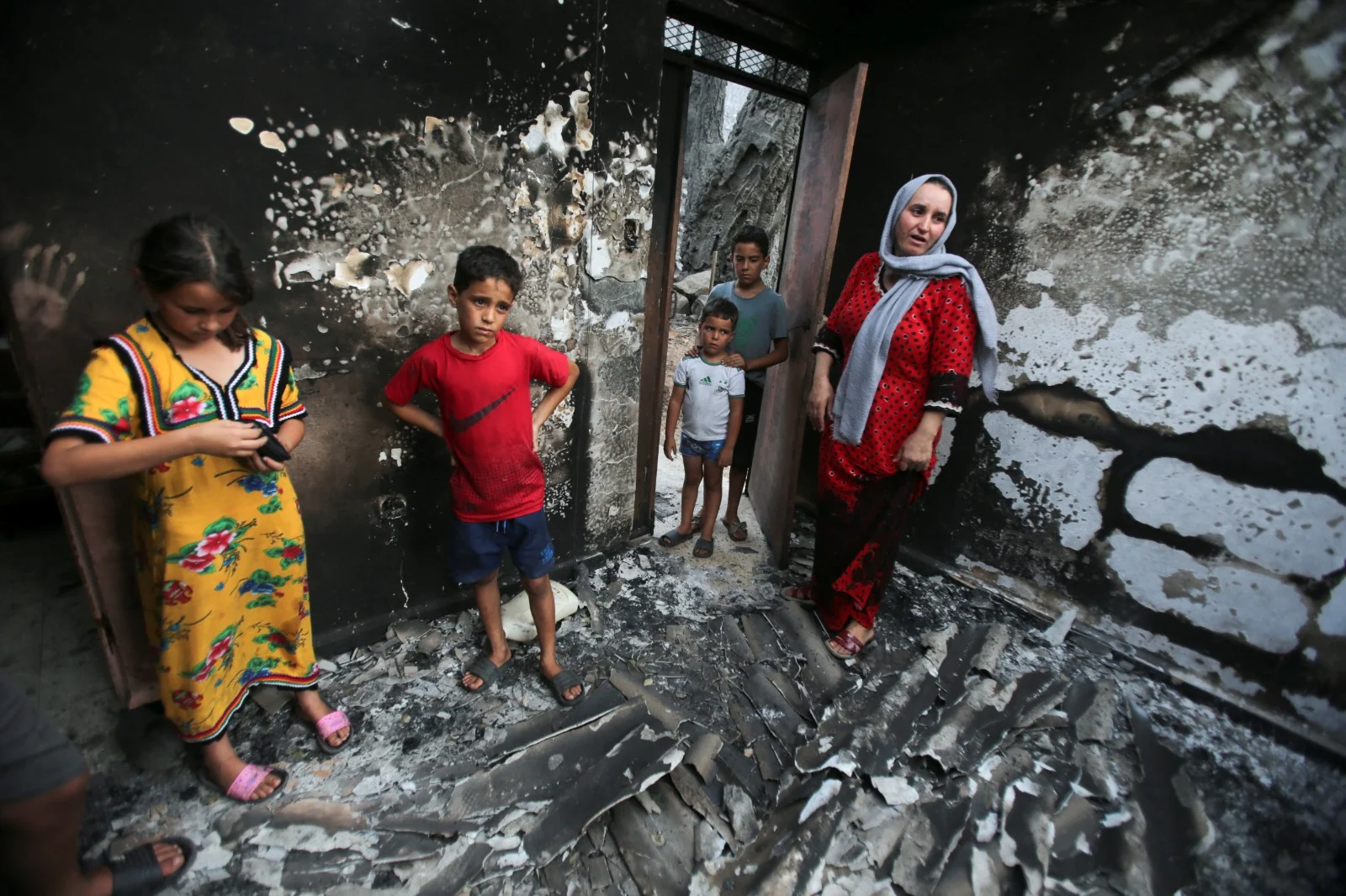 בני משפחה באלג'יריה עומדים בתוך ביתם השרוף | צילום: רויטרס