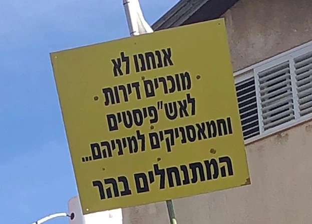 בתוך כך, שלט בעל מסר גזעני כנגד ערבים הוצב בעיר, ובו נכתב: "אנחנו לא מוכרים דירות לאש"פיסטים וחמאסניקים". זאת ככל הנראה בעקבות המחאה נגד מכירת בתים לאזרחים ערבים בעיר.