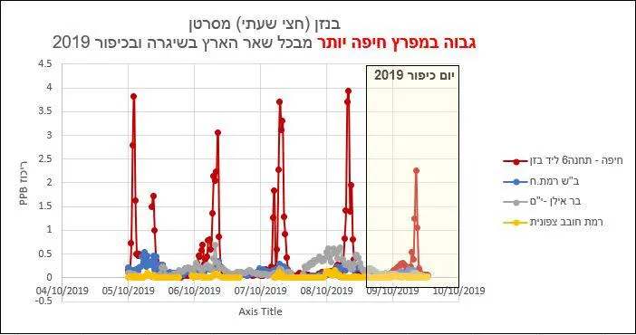 בתוך כך, מרכז מחקר סביבתי חיפה כי באזור מפרץ חיפה נמדדו ערכי בנזן גבוהים מאשר ביום הכיפורים שעבר, ויותר מאשר ביום שבת רגיל.