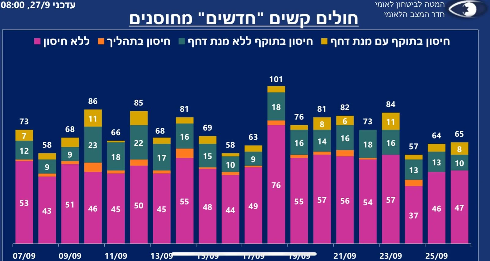 בתוך כך, משרד הבריאות פרסם הבוקר נתונים מעודכנים של תחלואת הקורונה ולפיהם אתמול נוספו 3,208 מאומתים לנגיף ונערכו 76,257 אלף בדיקות בלבד. שיעור המאומתים מבין הנבדקים עמד על 4.3% ומקדם ההדבקה ירד ל-0.76 . מספר החולים הקשים הוא 671. מספר המתחסנים במנה השלישית אתמול עמד על 33,863 ו-5,553 קיבלו אתמול את המנה השנייה. 5,347 ישראלים קיבלו אתמול את המנה הראשונה של החיסון. מדובר בעלייה מתונה במספר המתחנים ביחס לימים הקודמים, אך המספר נמוך משמעותית ממספר המתחסנים בימים הראשונים של חודש ספטמבר.