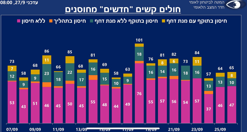 עוד עולה מהנתונים כי רובם המוחלט של החולים הקשים בימים האחרונים אינם מחוסנים כלל ומעטים מאוד מהם התחסנו במנה השלישית. כך למשל, אתמול נוספו 65 חולים קשים חדשים, כאשר 47 מהם לא היו מחוסנים כלל, 10 היו בתהליכי חיסון ו-8 בלבד חוסנו במנה השלישית.