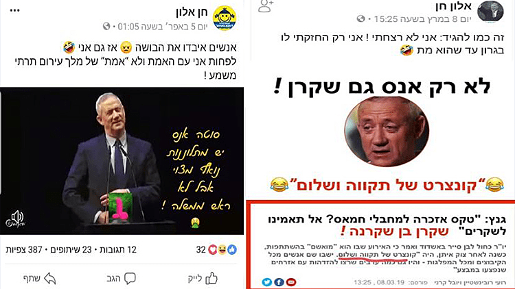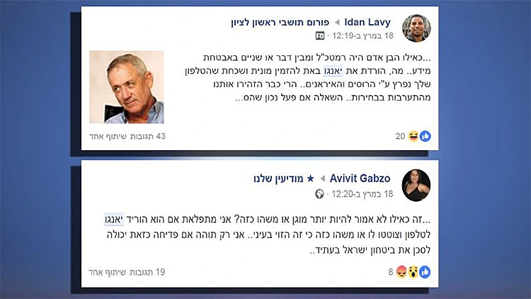 גולשת בשם רונית כהן, מתפעלת פרופיל פיקטיבי בשם רוית קורן, שעסוק בהפצת ידיעות כוזבות על בני גנץ בקבוצות באזור אשקלון, אשדוד ובאר שבע כשלעיתים שני הפרופילים גם מנהלים שיחות ביניהם כשהמטרה של אלו היא לייצר התססה בקבוצות. והתופעה הזו לא נגמרת – פייסבוק כשלה חרוצות ביצירת מנגנון שמתמודד עם הבעיה הזו. במקביל בליכוד יצרו מנגנון משומן למשעי שמסוגל לשלוט בעברת המידע, מספק חומרים לפעילים להפצה ברשת – ומצליח לשלוט בתזמוני פרסום המסרים של הקמפיין והדהודם.