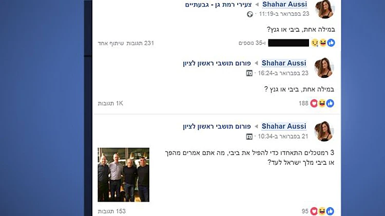 והשניים האלו לא לבד שחר אוסי, חיילת משוחררת יפהפייה מעבירה את זמנה בין קבוצות פייסבוק עירוניות שונות בתהייה "ביבי או גנץ?"